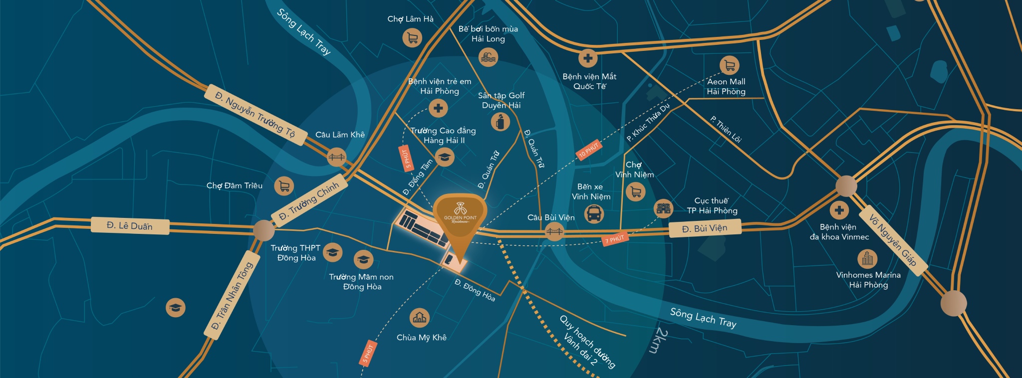 Golden Point Residences khẳng định lợi thế “đô thị 4 mặt tiền” khi tiếp giáp các trục giao thông huyết mạch: đường Bùi Viện 65m, vành đai 2, đại lộ Thời Đại 40m cùng tuyến đường nối thẳng sang Dương Kinh trong tương lai. Từ đây, cư dân dễ dàng kết nối tới những điểm trọng yếu của thành phố Hải Phòng và lân cận chỉ trong vài phút di chuyển.
